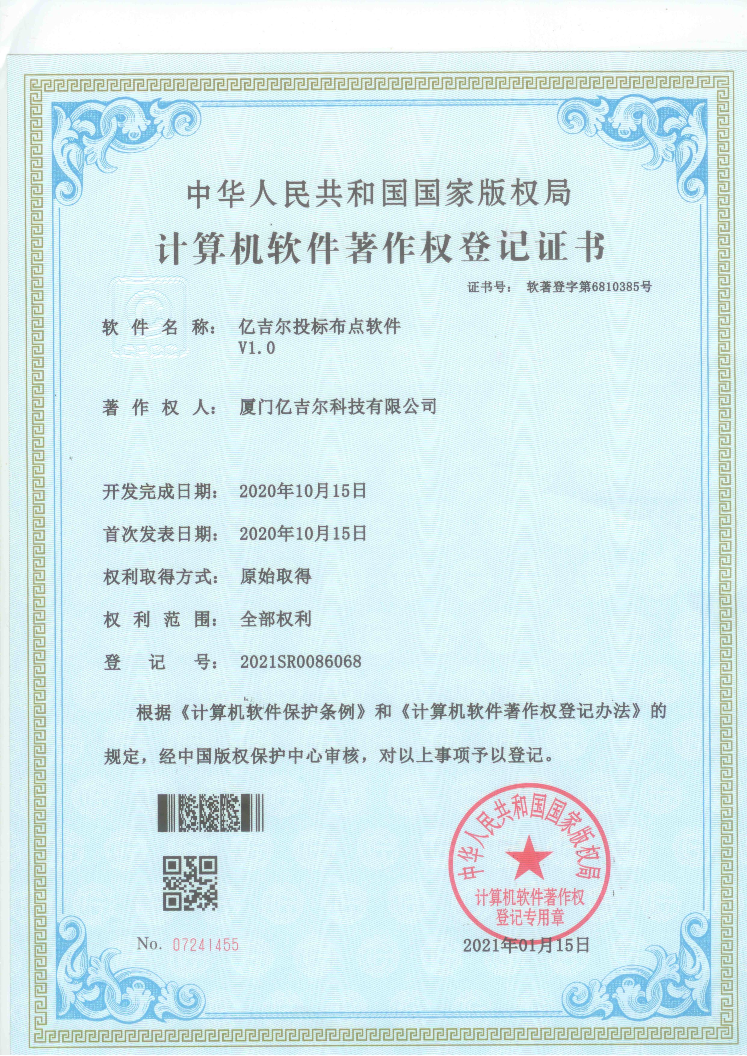 億吉爾投標(biāo)布點(diǎn)軟件著作權(quán)證書 發(fā)布日期:2023年11月22日 瀏覽次數(shù):1823 關(guān)鍵字: 公司 1/1億吉爾投標(biāo)布點(diǎn)軟件著作權(quán)登記證書