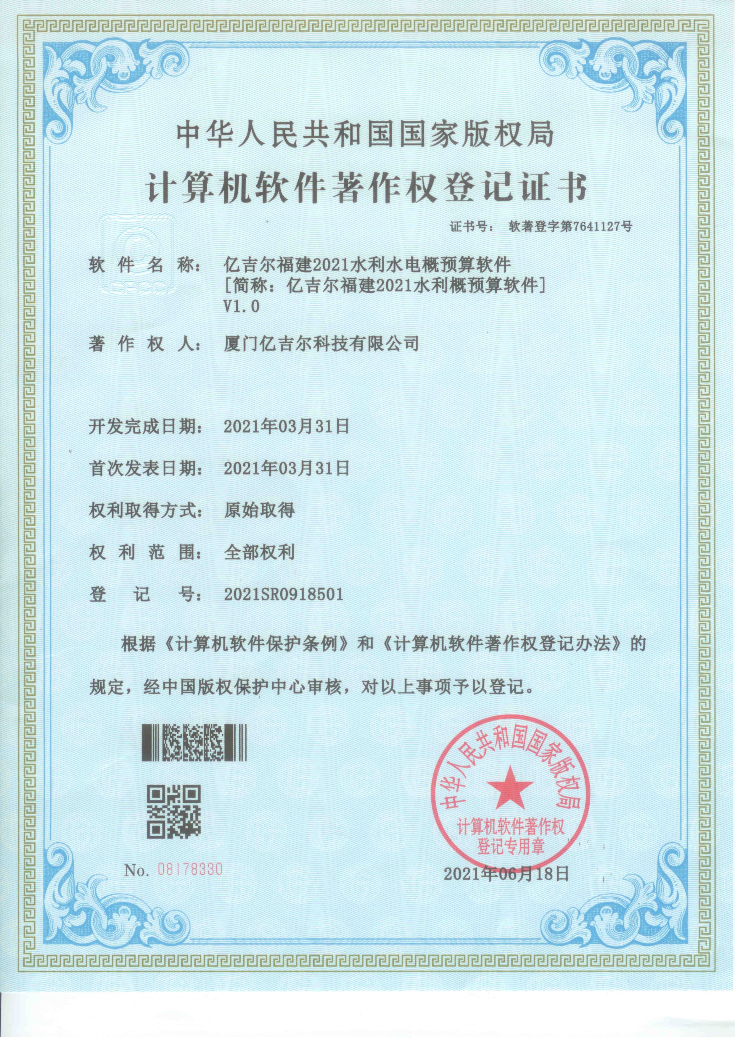 億吉爾福建2021水利水電概預(yù)算軟件著作權(quán)證書 發(fā)布日期:2023年11月22日 瀏覽次數(shù):1828 關(guān)鍵字: 公司 1/1億吉爾福建2021水利水電概預(yù)算軟件著作權(quán)證書
