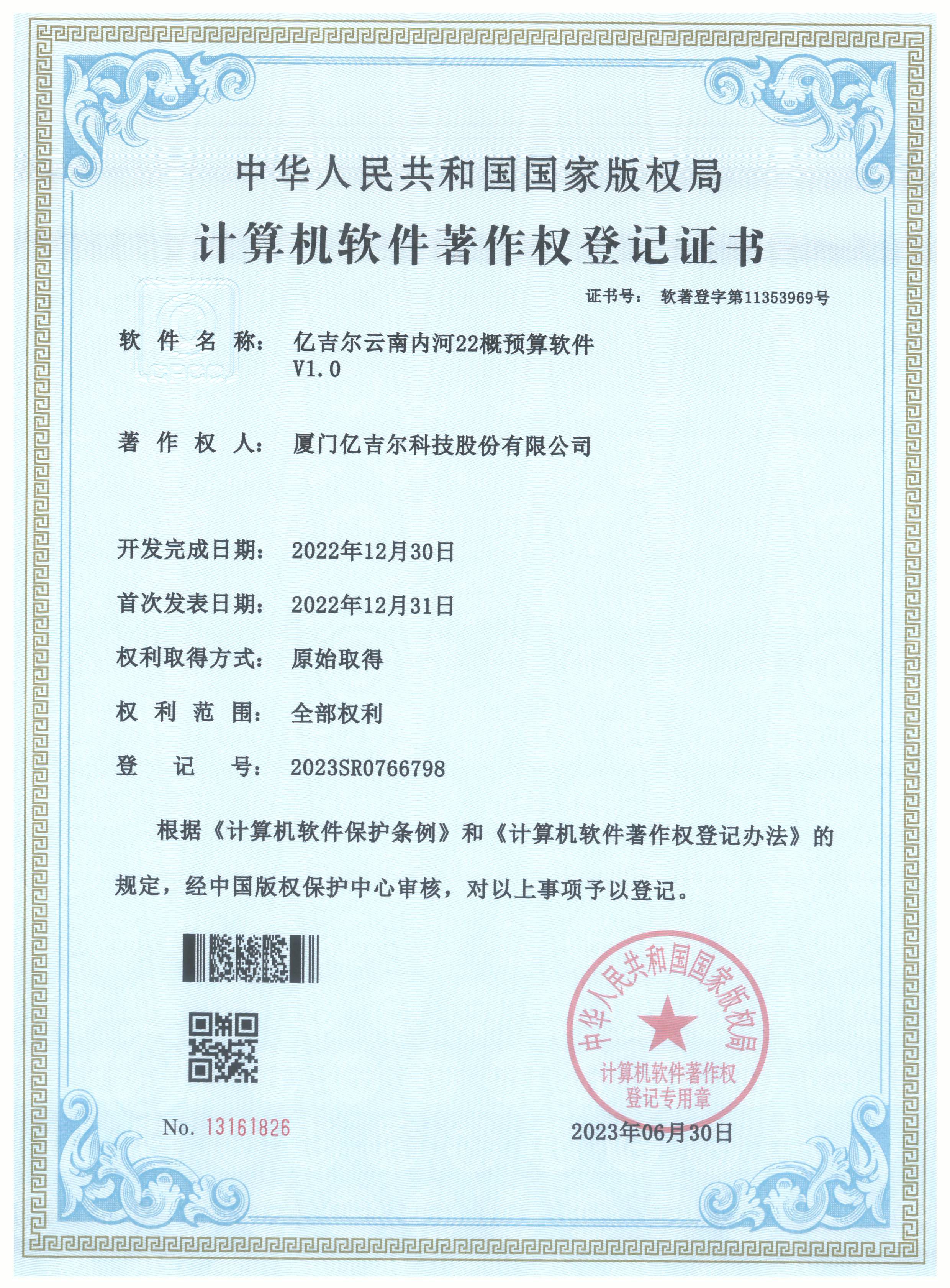 億吉爾云南內(nèi)河22概預(yù)算軟件登記證書 發(fā)布日期:2023年11月22日 瀏覽次數(shù):1839 關(guān)鍵字: 公司 1/1億吉爾云南內(nèi)河22概預(yù)算軟件登記證書(2023R11L0546651)