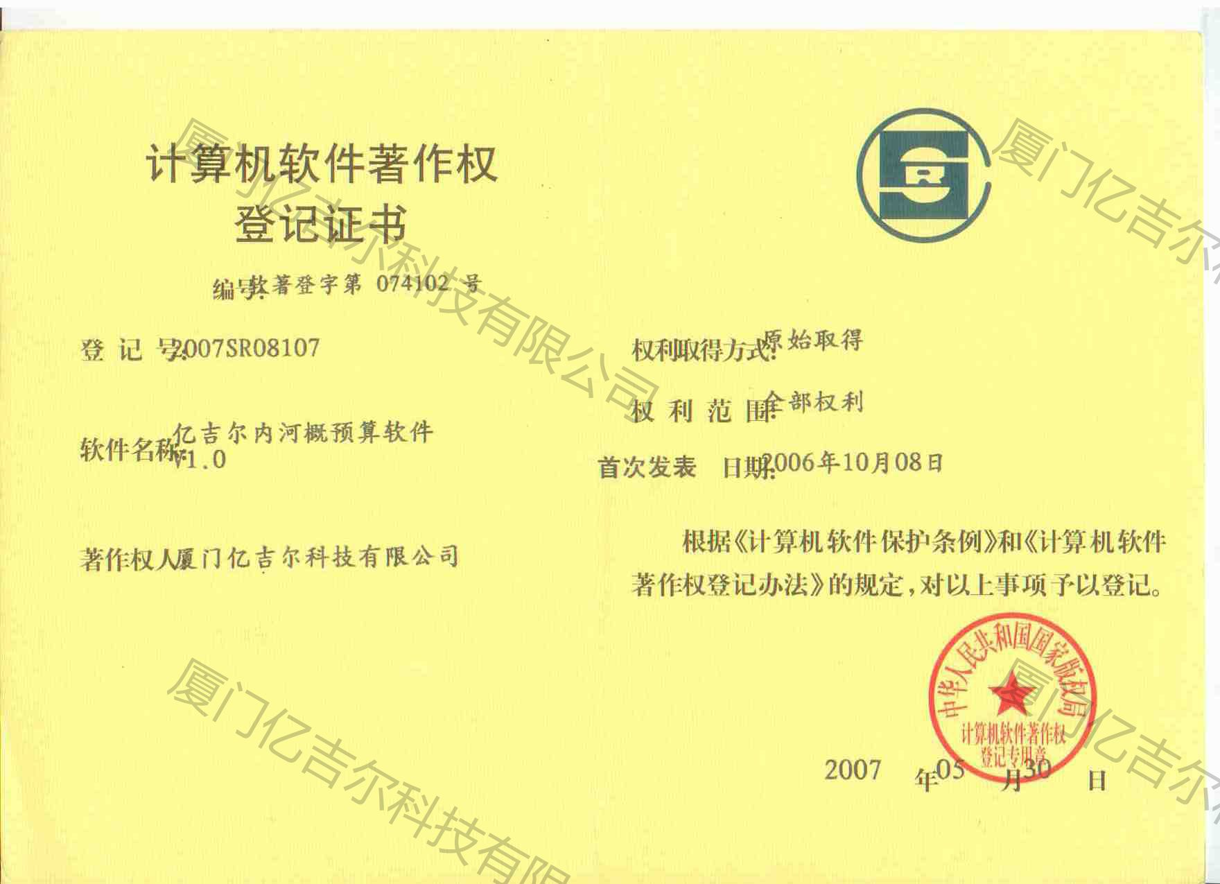 億吉爾內(nèi)河概預(yù)算軟件著作權(quán)登記證書 發(fā)布日期:2007年05月30日 瀏覽次數(shù):3211 關(guān)鍵字: 公司 1/1億吉爾內(nèi)河概預(yù)算軟件著作權(quán)登記證書