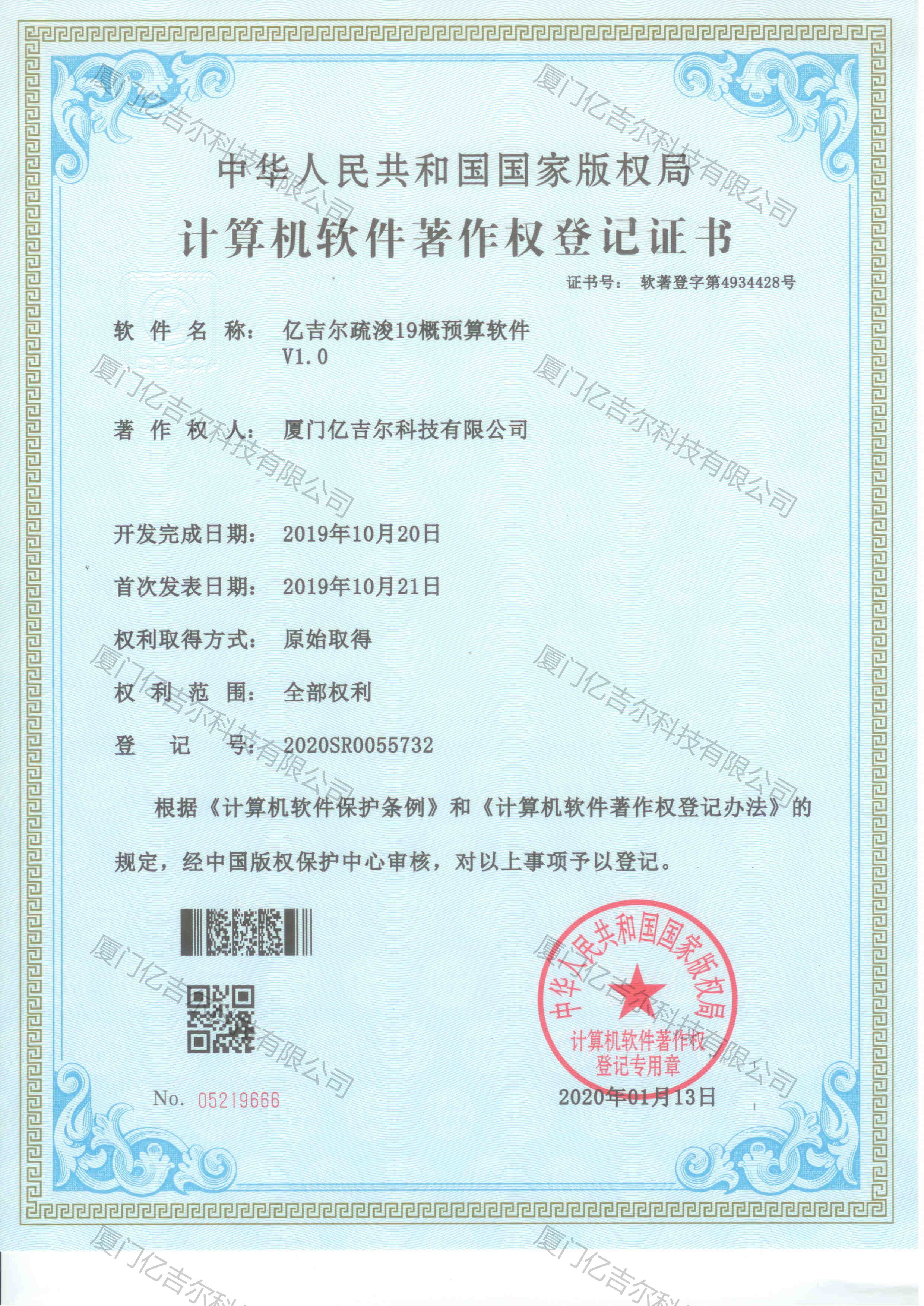 億吉爾疏浚19概預(yù)算軟件著作權(quán)登記證書 發(fā)布日期:2020年01月13日 瀏覽次數(shù):3944 關(guān)鍵字: 公司 1/1億吉爾疏浚19概預(yù)算軟件著作權(quán)登記證書
