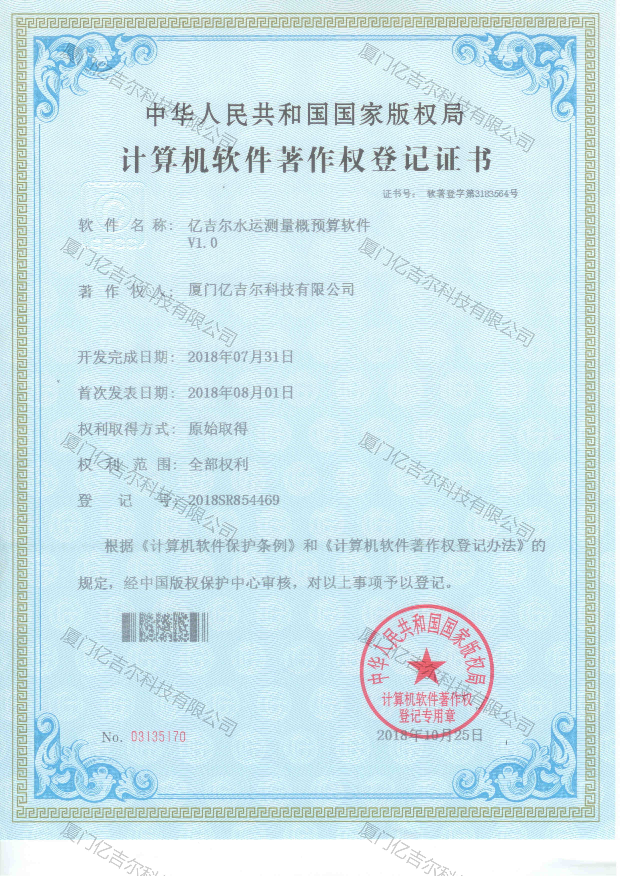 億吉爾水運測量概預(yù)算軟件著作權(quán)登記證書 發(fā)布日期:2018年10月25日 瀏覽次數(shù):3547 關(guān)鍵字: 公司 1/1億吉爾水運測量概預(yù)算軟件著作權(quán)登記證書