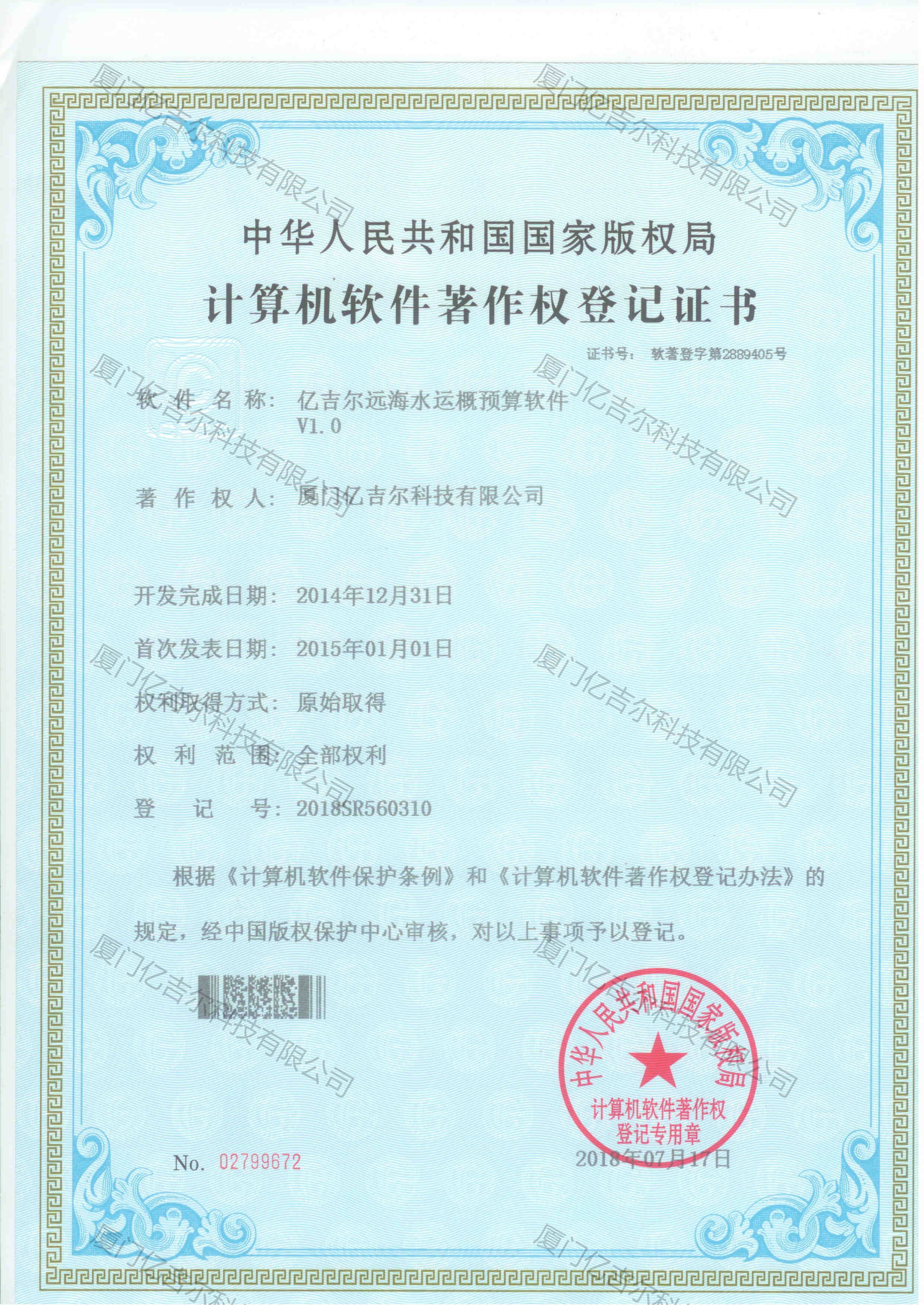 億吉爾遠海水運概預算軟件著作權(quán)登記證書 發(fā)布日期:2018年07月17日 瀏覽次數(shù):3396 關(guān)鍵字: 公司 1/1億吉爾遠海水運概預算軟件著作權(quán)登記證書
